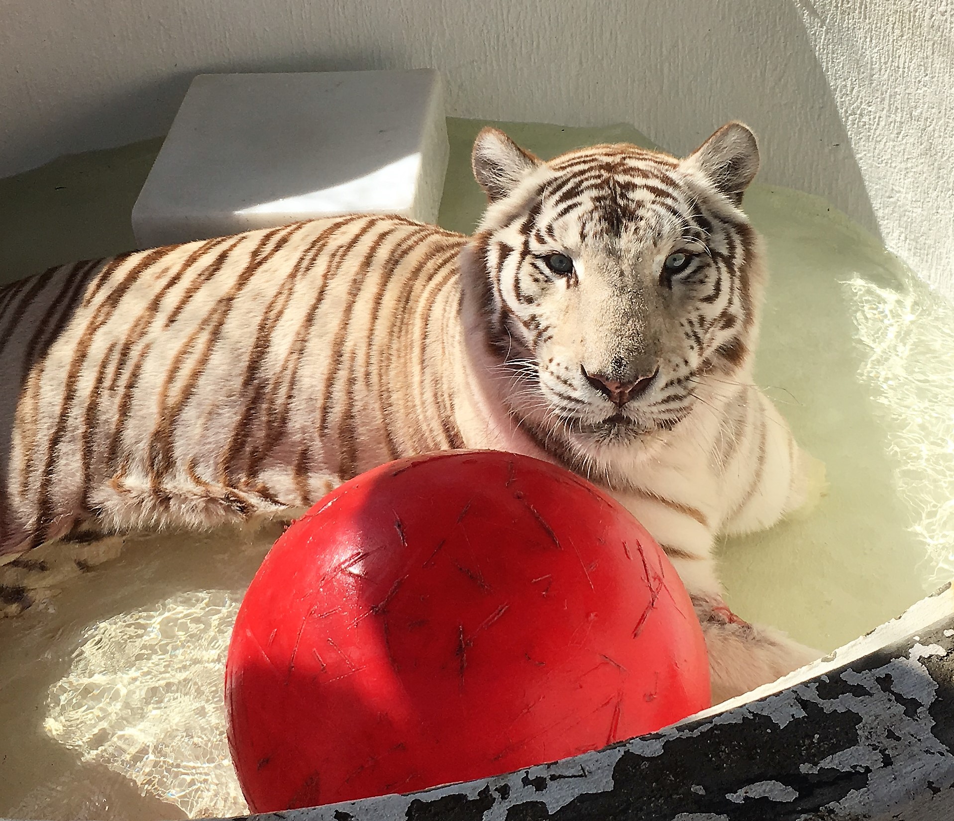 A white tiger lies in shallow water next to a large red ball, looking toward the camera. Sunlight casts shadows across its body.