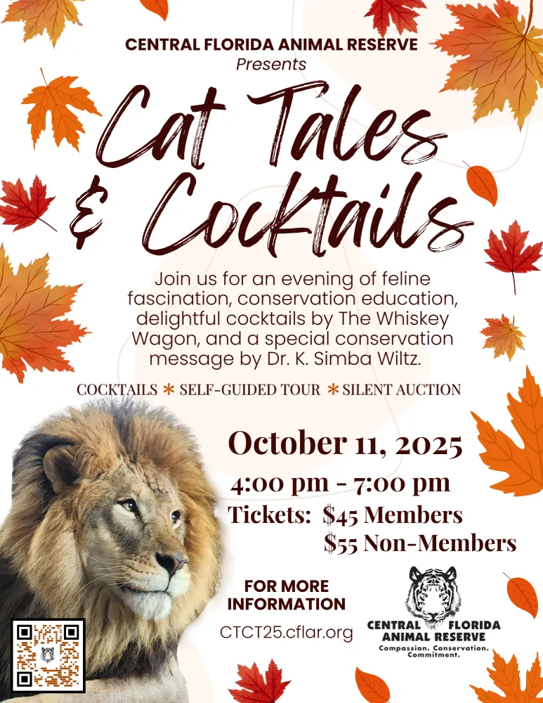 Central Florida Animal Reserve logo, a cocktail, a lion, and text reading "Cat Tales & Cocktails" with an autumn leaf border.